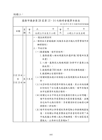 基隆市議會第 20 屆第 13、14 次臨時會議事日程表