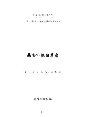 中 華 民 國 114 年度 中 華 (自114年1月1日起至114年12月31日止) 民 國 114 年 度 基 隆 市 總 預 算 案 ︵ 基隆市總預算案 第 一 次 追 加 ︵ 第 一 次 追 加 (減) 預 算 案 減 ︶ 預 算 ︶ 基隆市政府編 2144