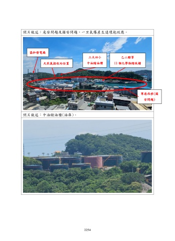 照片敘述〆危安問題及國安問題,一旦氣爆產生連環炮效應。 協和發電廠 三大四小 乙二醇等 天然氣接收站位置 中油儲油槽 11 個化學物儲放槽 軍港西移(國 安問題) 照片敘述〆中油儲油槽(油庫)。 2254
