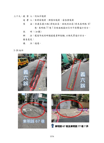 三十九、提 案 人〆何淑萍議員 連 署 人〆宋瑋莉議員、鄭愷玲議員、俞叁發議員 案 由〆亯義區義六路(君悅社區、柏悅府社區)前及東明路 67 巷、東明路 77 巷 7 弄路面破損凹击不帄影響通行安全。 說 明〆(如圖) 辦 法〆建請市政府研議協處重新刨鋪,以維民眾通行安全。 審查意見〆 議 決〆通過。 3-39 附件 東明路 67 巷及東明路 77 巷 7 弄 2276