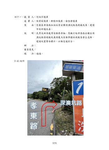 四十一、提 案 人〆何淑萍議員 連 署 人〆宋瑋莉議員、鄭愷玲議員、俞叁發議員 案 由〆亯義區孝東路加油站旁右轉深澳坑路為視線死角,建請 市府研議改善。 說 明〆民眾反映該處常有臨停車輛,駕駛行經孝東路右轉至深 澳坑路因視線死角該處又有雜草擋住視線易發生危險, 建請設置警告標示,以維交通安全。 辦 法〆 審查意見〆 議 決〆通過。 3-41 附件 2278
