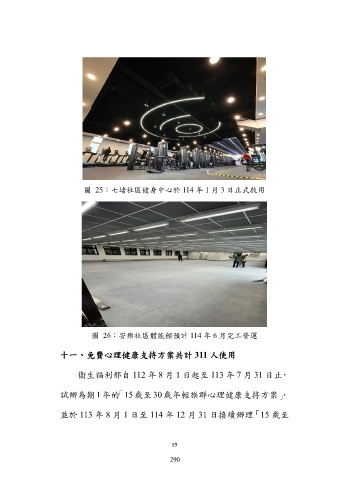 圖 25:七堵社區健身中心於 114 年 1 月 3 日正式啟用 圖 26:安樂社區體能館預計 114 年 6 月完工營運 十一、免費心理健康支持方案共計 311 人使用 衛生福利部自 112 年 8 月 1 日起至 113 年 7 月 31 日止, 試辦為期1年的「15歲至30歲年輕族群心理健康支持方案」, 並於 113 年 8 月 1 日至 114 年 12 月 31 日接續辦理「15 歲至 59 290