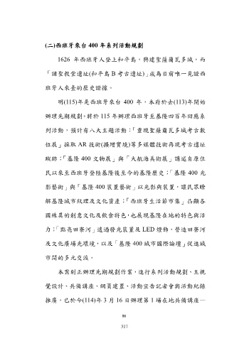 辦理先期規劃。將於 115 年辦理西班牙至基隆四百年回應系