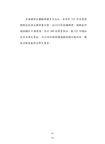 另為讓學生體驗跨國多元文化,本市於 112 年首度開 辦新住民語文樂學夏令營,去(113)年持續辦理,開辦泰印 越語總計 8 個營隊,共計 160 位學童參加,較 112 年增加 近百名學生參加,今(114)年將持續規劃相關活動內容,期 使活動更能符合學生需求。 101 332