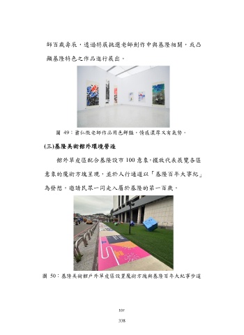 師百歲壽辰,透過特展挑選老師創作中與基隆相關,或凸 顯基隆特色之作品進行展出。 圖 49:蕭仁徵老師作品用色鮮豔,情感濃厚又有氣勢。 (三)基隆美術館外環境營造 館外草皮區配合基隆設市 100 意象,擺放代表展覽各區 意象的魔術方塊呈現,並於人行通道以「基隆百年大事紀」 為發想,邀請民眾一同走入屬於基隆的第一百歲。 圖 50:基隆美術館戶外草皮區設置魔術方塊與基隆百年大紀事步道 107 338