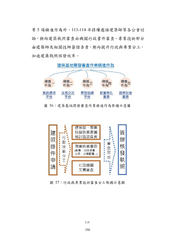 等 5 項精進作為外,113-114 年持續邀請建築師等各公會討 論,朝向建築執照審查由機關行政書件審查、專業技術部分 由建築師及相關技師簽證負責,朝向提升行政與專業分工, 加速建築執照核發效率。 圖 56:建築基地開發審查作業精進作為架構示意圖 圖 57:行政與專業技術審查分工架構示意圖 119 350