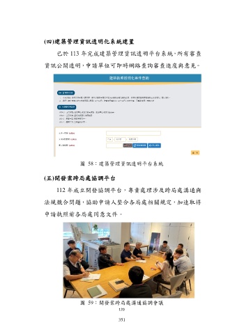 (四)建築管理資訊透明化系統建置 已於 113 年完成建築管理資訊透明平台系統,所有審查 資訊公開透明,申請單位可即時網路查詢審查進度與意見。 圖 58:建築管理資訊透明平台系統 (五)開發案跨局處協調平台 112 年成立開發協調平台,專責處理涉及跨局處溝通與 法規競合問題,協助申請人整合各局處相關規定,加速取得 申請執照前各局處同意文件。 圖 59:開發案跨局處溝通協調會議 120 351