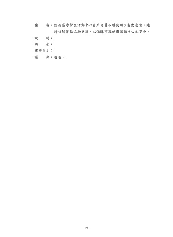 案 由:信義區孝賢里活動中心窗戶老舊不堪使用且鬆動危險,建 請相關單位協助更新,以保障市民使用活動中心之安全。 說 明: 辦 法: 審查意見: 議 決:通過。 ~29~ 29