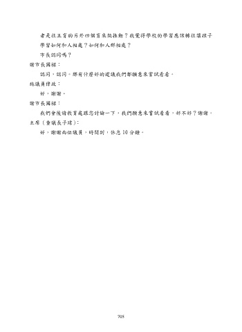 者是往五育的另外四個育來做推動?我覺得學校的學習應該轉往讓孩子 學習如何和人相處?如何和人群相處? 市長認同嗎? 謝市長國樑: 認同,認同。那有什麼好的建議我們都願意來嘗詴看看。 施議員偉政: 好,謝謝。 謝市長國樑: 我們會後請教育處跟您討論一下,我們願意來嘗詴看看,好不好?謝謝。 主席(童議長子瑋): 好,謝謝兩位議員,時間到,休息 10 分鐘。 705